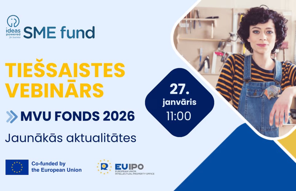 27. janvārī, no plkst. 11.00 līdz 12.00, ikviens interesents tiek aicināts piedalīties Eiropas Savienības Intelektuālā īpašuma biroja (EUIPO) tiešsaistes vebinārā “Mazo un vidējo uzņēmumu (MVU) fonds 2026 – atbalsts biznesam intelektuālā īpašuma reģistrācijai un aizsardzībai”.