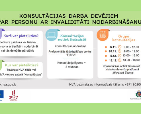 VisasDarba devējiem, kuri nodarbina vai plāno nodarbināt darbiniekus ar invaliditāti, Nodarbinātības valsts aģentūra (NVA) novembrī un decembrī rīko četras bezmaksas konsultācijas par personu ar invaliditāti nodarbināšanas jautājumiem.…