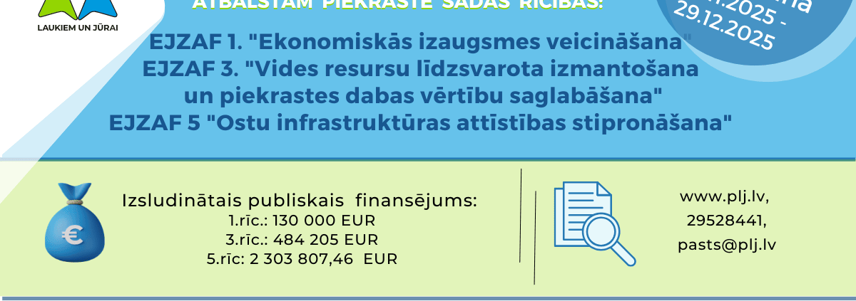 Biedrība “Partnerība Laukiem un jūrai” izsludina projektu pieteikumu pieņemšanas 4.kārtu Eiropas Jūrlietu, zvejniecības un akvakultūras fonda (EJZAF) šādās rīcībās un ar šādu publisko finansējumu: