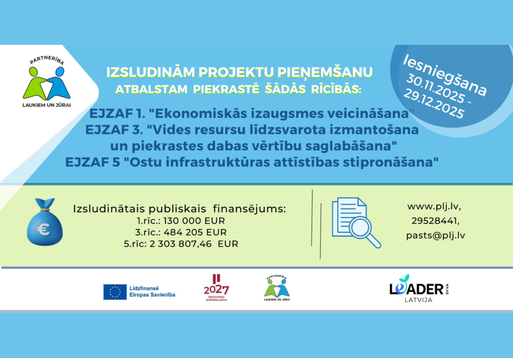 Biedrība “Partnerība Laukiem un jūrai” izsludina projektu pieteikumu pieņemšanas 4.kārtu Eiropas Jūrlietu, zvejniecības un akvakultūras fonda (EJZAF) šādās rīcībās un ar šādu publisko finansējumu: