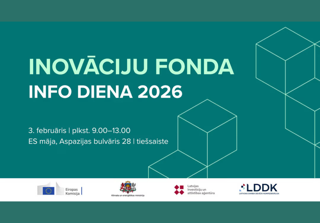 Inovāciju fonda informācijas diena 2026 notiks Eiropas Savienības mājā (Aspazijas bulvārī 28, Rīgā) 3. februārī no pulksten 9.00 līdz 13.00. Pēc publiskās daļas uzņēmumiem paredzētas iepriekš plānotas individuālas konsultācijas ar Eiropas Komisijas (DG CLIMA), Eiropas Klimata, infrastruktūras un vides izpildaģentūras (CINEA), Eiropas Investīciju bankas (EIB) pārstāvjiem.